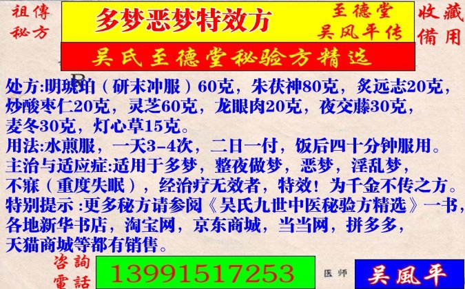 主治与适应症:适用于多梦,整夜做梦,恶梦,淫乱梦,不寐(重度失眠),经治疗无效者,特效!为千金不传之方。