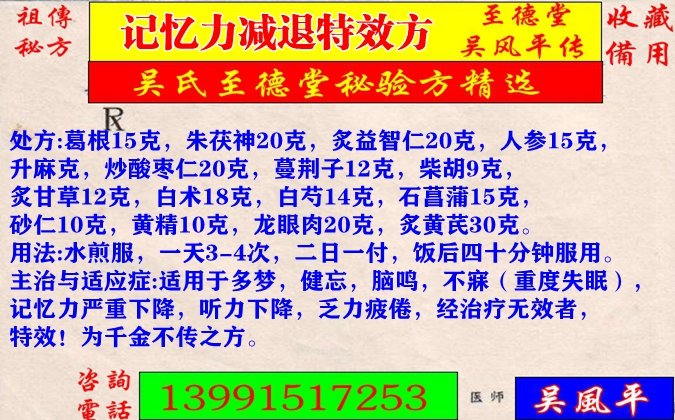 主治与适应症:适用于多梦,健忘,脑鸣,不寐(重度失眠),记忆力严重下降,听力下降,乏力疲倦,经治疗无效者,特效!为千金不传之方。