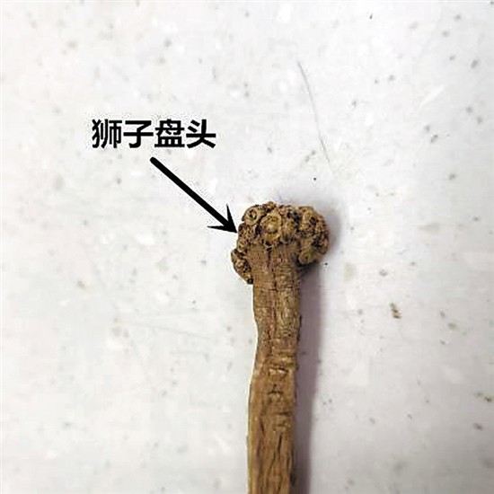 华成坤介绍,党参的根头部有多数疣状突起的茎痕及芽,每个茎痕的顶端呈凹下的圆点状,好像石狮子头的卷毛造型一样,因此俗称“狮子盘头”。伞形科植物迷果芹的根,外形与党参相似,但没有“狮子盘头”。