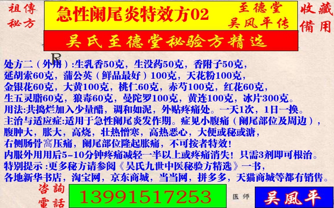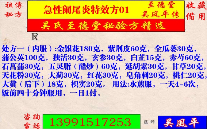 主治与适应症:适用于急性阑尾炎发作期。症见小腹痛(阑尾部位及周边),腹肿大,胀大,高烧,壮热憎寒,高热恶心,大便或秘或溏,右侧肠骨窩压痛,阑尾部位隆起胀痛,不可按者特效!内服外用用后5-10分钟疼痛减轻一半以上或疼痛消失!只需3剂即可根治。