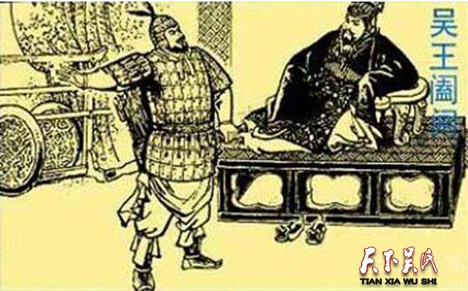司马迁:“阖闾弑僚,宾服荆楚。” “吴阖庐选多力者五百人,利趾者三千人,以为前陈,与荆战,五战五胜,遂有郢。东征至于庳庐,西伐至於巴、蜀,北迫齐、晋,令行中国。”