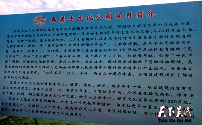 800多年前,吴善士公迁居惠来乌石村开基创业,开枝散叶,英才辈出,兴旺发达,裔孙遍布海内外。今天,惠来吴氏在惠来县吴氏善士祖理事会吴喜钦会长的带领下,全体族亲同心同德,齐心合力,吴善士文化公园暨善士祖祠建设项目工程一定会顺利推进并取得圆满成功。他们这种尊宗敬祖的行动,勇于担当的气魄,值得称道和敬佩,将激励我们并教育子孙尊宗敬祖,铭记祖德。