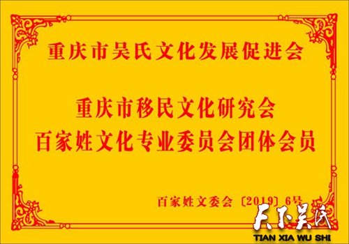 天下吴氏网(吴蜀丰)重庆吴氏,时逢盛世,国泰民安,2019年6月8日,经过申请有幸获得审批,成为重庆市移民文化研究会(备案主管单位重庆市民政局)百家姓专业委员会团体会员——重庆吴氏文化发展促进会(简称重庆吴氏文促会),实乃荣幸之至,让常年在外漂泊打拼的游子,让在重庆发展创业的吴氏,让九十多万土生土长的山城吴氏宗亲终于有了一个停泊的港湾,一个温馨的家。