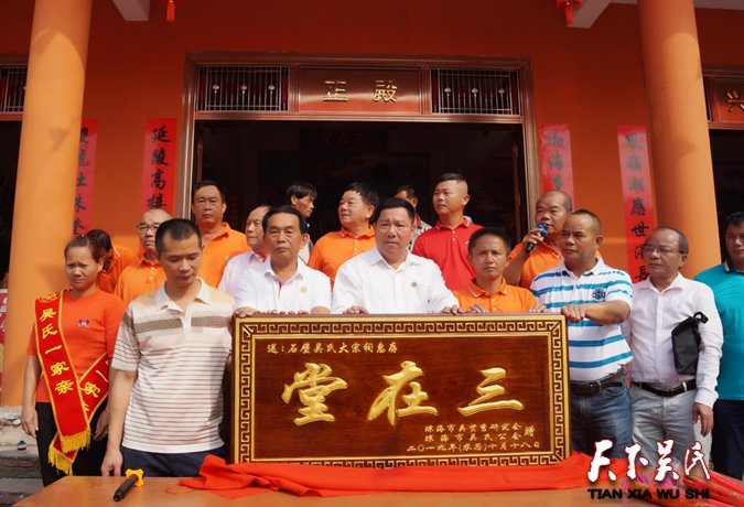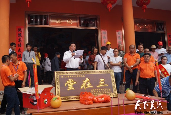 上午10时正,由琼海市吴贤秀研究会会长吴平致辞!揭牌!回火升殿安座大吉!石壁“吴氏大宗祠”,是唐代户部尚书,渡琼始祖吴贤秀公、玟公、21世祖拔公为主殿,25世祖兴公、真公、元益、道丰、福祥、真悌、如云、中植、道珍、道愈、经现等诸祖先。其支世系子孙后代宗亲繁衍分布遍全海南岛各县市及海内外。是目前海南最大的吴氏宗祠。每年的正月初八是祭祠庆典日。