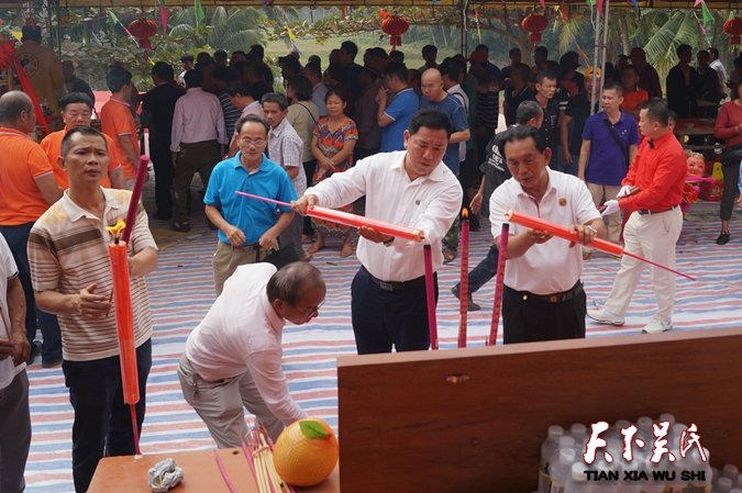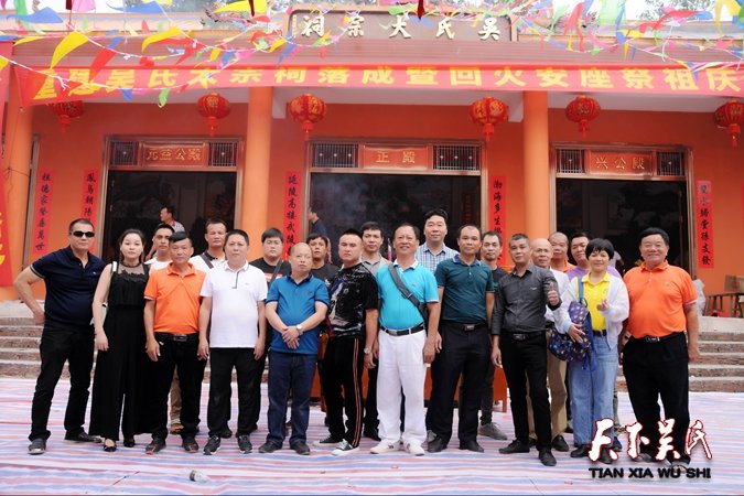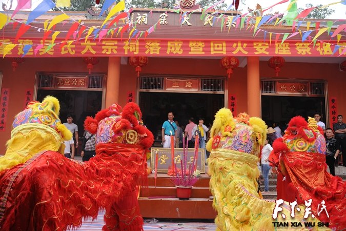 天下吴氏网讯(吴乾山海南报道)2019年11月14日,上午暖阳煦照,椰风习习,万泉河衅,中风村,礼炮三响,“吴氏大宗祠”改建殿莹回火安座仪式开始:重请师圣,挥笔点主,先祖灯坛,趙楼旺相,逾火扬威,舞狮驱邪,升殿安座,谢师关圣,福归主人,进香奉祀等祭祖法事有序进行。琼海市吴贤秀文化艺术舞师队表演“龙腾虎跃,狮舞蛇飞”精彩纷呈。