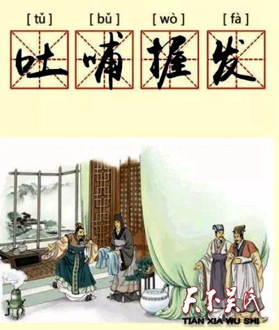 《韩诗外传》载:周成王把周公的长子伯禽封在鲁地。临行之前,周公告诫儿子说:你去以后,千万不要以自己就封鲁国而慢待士人。我是文王之子,武王之弟,成王之叔父,又担任宰相。我对于天下人来说不算低贱吧。但我洗一次头,要几次握住头发,中止洗头来接待士人;吃一顿饭,要数次把食物吐出来,及时回答士人的问题。即使这样,我还担心失去天下贤人辅助。因此你去接管鲁国,一定要谦虚谨慎,尊重贤才,无论如何不能骄傲自满。典故“握发吐哺”即由此而来。《史记·鲁周公世家》也记载了这件事。后以“握发吐哺”比喻勤政为国,礼贤下士,尊重人才。三国时曹操作诗说:“周公吐哺,天下归心。”有道是:士为知己者而用,士为知己者而死。国家尊重贤才,贤才就会知恩图报。这确实是一条规律。