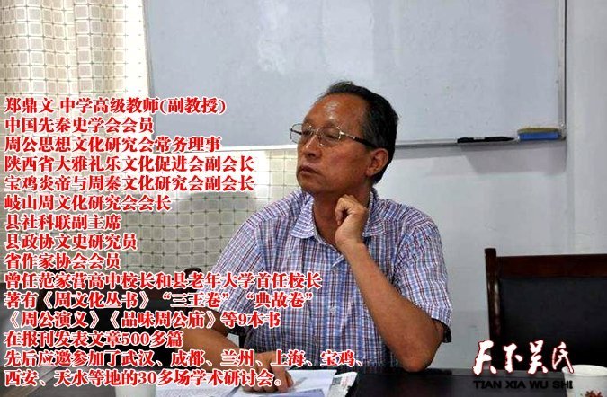 【作者简介】郑鼎文,大学文化,中学高级教师(副教授),中国先秦史学会会员,周公思想文化研究会常务理事,陕西省大雅礼乐文化促进会副会长,宝鸡炎帝与周秦文化研究会副会长,岐山周文化研究会会长,县社科联副主席,县政协文史研究员,省作家协会会员,曾任范家营高中校长和县老年大学首任校长,著有《周文化丛书》“三王卷”“典故卷”、《周公演义》《品味周公庙》等9本书,在报刊发表文章500多篇。先后应邀参加了武汉、成都、兰州、上海、宝鸡、西安、天水等地的30多场学术研讨会。