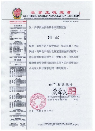 世界至德徳总会致吴学良唁函