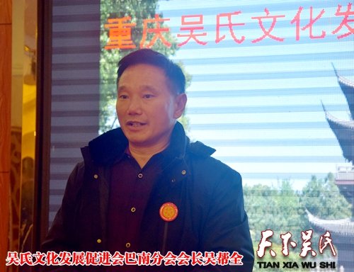 吴氏文化发展促进会巴南分会会长吴帮全发表就职演讲,表示一定尽职尽责带好头、办好事,为巴南吴氏办实事。