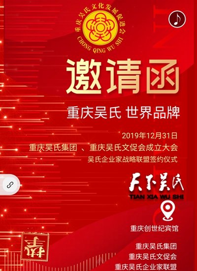 重庆吴氏集团、重庆吴氏文化发展促进会、重庆吴氏企业家联盟,邀请全球、国内及重庆市有关领导、中国知名品牌企业CEO、兄弟省市自治区的吴氏企业和协会主要领导、重庆吴氏文促会区县分会领导和吴氏宗亲代表,于2019年12月31日(星期六)下午14:38,在重庆创世纪酒店举办 “重庆吴氏集团、重庆吴氏文促会成立大会暨重庆吴氏企业家战略联盟签约仪式”。