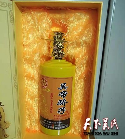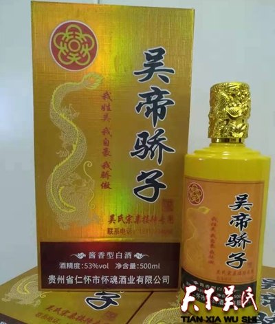 《吴帝骄子酒》秉承着对吴氏文化的传承,为弘扬泰伯谦让精神而致力打造以品质、文化、服务建设、薪火相传的一款高端酱香白酒。《吴帝骄子酒》寓意着身为吴氏儿孙的我们倍感骄傲。也因为有了我们,吴氏文化才得以延续至今。品牌发展到现在深受吴氏宗亲们的欢迎及高度认可。