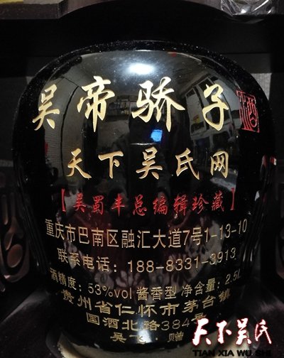 贵州省仁怀市怀魂酒业有限公司为重庆吴氏集团、重庆吴氏文化发展促进会成立大会暨重庆吴氏企业家战略联盟签约仪式赞助酱香型《吴帝骄子酒》8件。