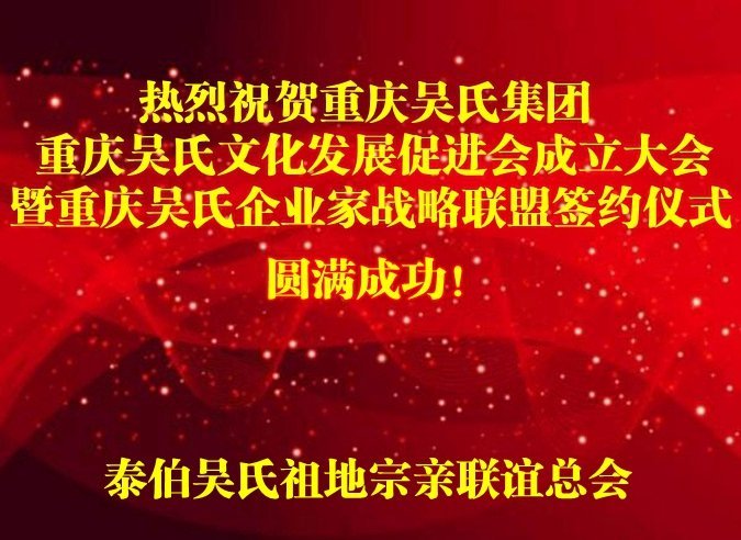 今天,重庆吴氏集团、重庆吴氏文促会成立大会暨重庆吴氏企业家战略联盟签约仪式,将团结聚集重庆吴氏家族宗亲,对传承、弘扬、研究吴氏文化、加强海内外吴氏经济文化的联系和交流将起到极大的推动作用!泰伯吴氏祖地宗亲联谊总会再次表示热烈的祝贺!