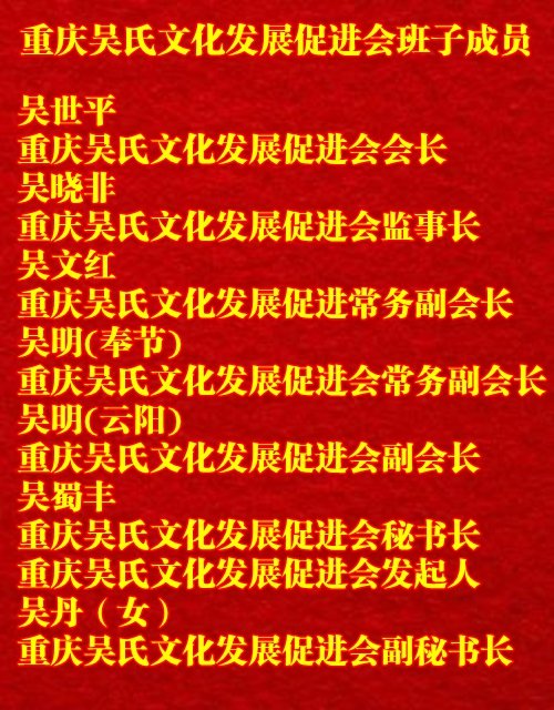 吴文红重庆吴氏文化(集团)有限公司常务副总裁、重庆吴氏实业(集团)有限公司总裁、重庆吴氏企业家联盟常务副理事长、重庆吴氏文化发展促进常务副会长。