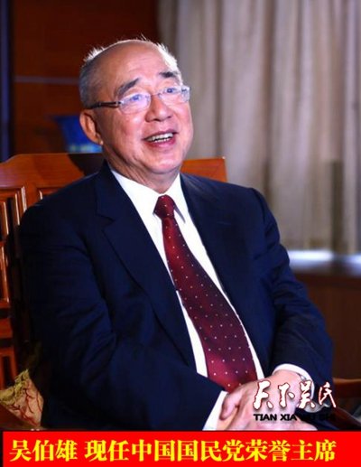 06吴伯雄,1939年6月19日出生。前桃园市市长吴鸿麟之子。曾任第10任中国国民党党主席、国际佛光会中华总会会长,现任中国国民党荣誉主席。2008年以国民党主席的身份率团访问中国大陆,为两岸关系的发展做出了重要贡献。吴伯雄表示,两岸人民同属中华民族,都是炎黄子孙,国共两党要有共同振兴中华民族的使命感,两岸同胞有责任传承和发扬中华文化义的贡献。吴伯雄祖籍为福建省永定县下洋镇思贤村 ,是一座地接广东省的闽西客家家庄,文风兴盛、保有中原士族纯朴遗绪。之后思贤村吴家于清朝咸丰年间,在吴伯雄的曾祖父吴圣昌(胜昌)的带领下,渡海迁台,落籍桃园中坜。尔后,吴伯雄的祖父吴荣棣来台后,在台成为光绪年间秀才,并为台湾文吟诗社社长,为当时台湾早期本土著名的乡土诗人,被现代历史学者誉为“文采德行、素孚桑梓”、“发皇汉学、厥功至伟”。而吴荣棣秀才育有八子三女,其中八兄弟有四位是医生,三子吴鸿麟,即为吴伯雄的父亲。吴鸿麟为日本九州大学医学博士、台北帝国大学外科医局长,后来与其大哥吴鸿森共同开创了中坜医院,而吴伯雄亦出生于此医院。吴鸿麟为国民党籍政治人物。其当年在中坜一带,义诊免费行医,获得乡里好评,因而受地方推举当选台湾省参议员以及”国大代表“,亦曾当选桃园县县长;今日桃园一带仍有许多以他为名号的慈善事业与奖学金补助。吴伯雄家境优渥,其本人曾透露,自己当年当选桃园县长之后,父亲吴鸿麟每个月都给他一笔生活补助费,其金额较薪水更高,以养清廉。
