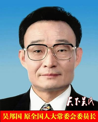 04吴邦国,男,汉族,1941年7月生,安徽肥东人,1964年4月加入中国共产党,1966年9月参加工作,清华大学无线电电子学系电真空器件专业毕业,大学学历,工程师。曾任中央政治局常委,十届全国人大常委会委员长、党组书记,十一届全国人大常委会委员长、党组书记。中共第十二届、十三届中央候补委员,十四届、十五届、十六届、十七届中央委员,十四届中央政治局委员,十四届四中全会增补为中央书记处书记,十五届中央政治局委员,十六届、十七届中央政治局委员、常委。第十届、十一届全国人大常委会委员长。