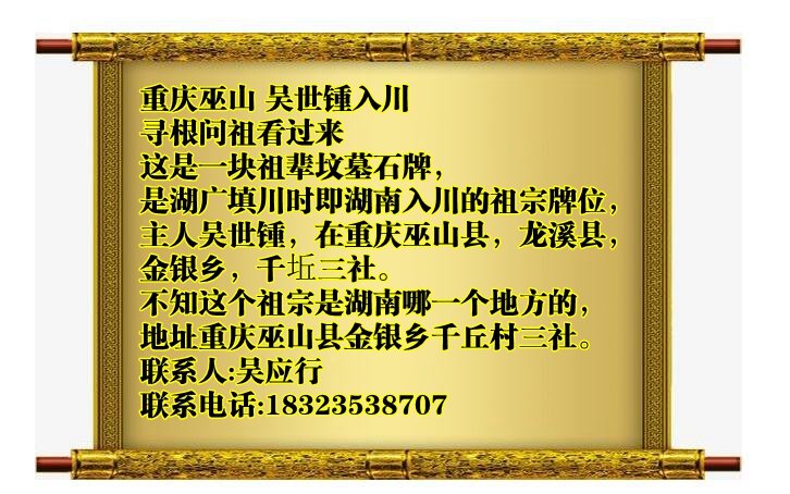 这是一块祖辈坟墓石牌,是湖广填川时即湖南入川的祖宗牌位,主人名川吴世锺,在重庆巫山县龙溪县金银乡千坵三社。