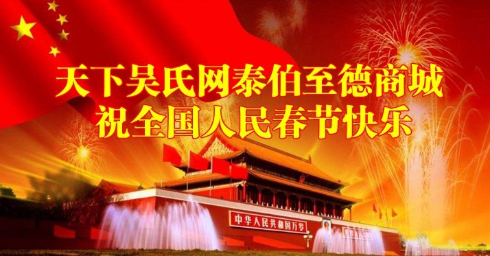 值此新春佳节之际,江西泰伯庙筹委员会全体人员向全世界吴氏宗亲拜年,天下吴氏一家亲,祝亲新年快乐!万事如意,身体健康,合家幸福,财源广进!天下吴氏一家亲,让我们弘扬致德精神,把三让高风,世家第一的吴文化代代相传,永放光芒。