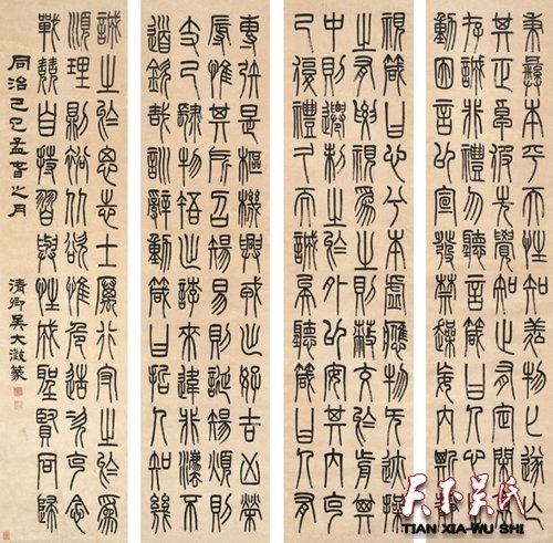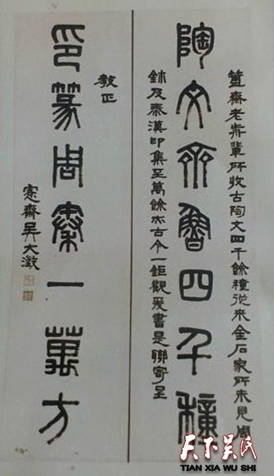 横批:一卧沧江。吴大澂精于鉴别和古文字考释,亦工篆刻和书画。吴大澂书法以篆书最为著名。他的篆书很有特色,将小篆古籀文结合,功力甚深,即平时书翰也常用工整精绝的篆字为之,规矩整齐,别有情致。早年师从陈硕父学篆书,中年以后又参照古籀文,书法益进。他开始学秦代小篆刻石,书法酷似李阳冰。后受杨沂孙的启示,将小篆与金文相结合,并用这种方法书写《论语》、《孝经》以及信札。他的篆书大小参差、渊雅朴茂,在当时是一种创造。他对金石文字有精深的研究,开拓了对先秦文字的广阔的视野,使他的篆书从中汲取了不少的营养。吴大澂写篆书,喜用隶书书款。他的隶书横平竖直,亦取法汉碑。行书学曾国藩,又颇有黄庭坚的趣味。吴大澂又以诗词及散文著称。著有《愙斋诗文集》、《说文古籀补》、《字说》、《愙斋集古录》、《古玉图考》、《权衡度量实验考》、《恒轩所见所藏吉金录》、《吉林勘界记》、《十六金符斋印存》等十余种。