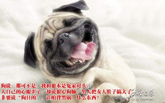 在《动物开会聊人类》中群情激奋的狗说:那可不是,我和狼本是冤家对头,人自己的心眼歪了,却说狼心狗肺;男人把女人肚子搞大了,非要说“狗日的”,让咱背黑锅,什么东西?