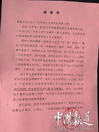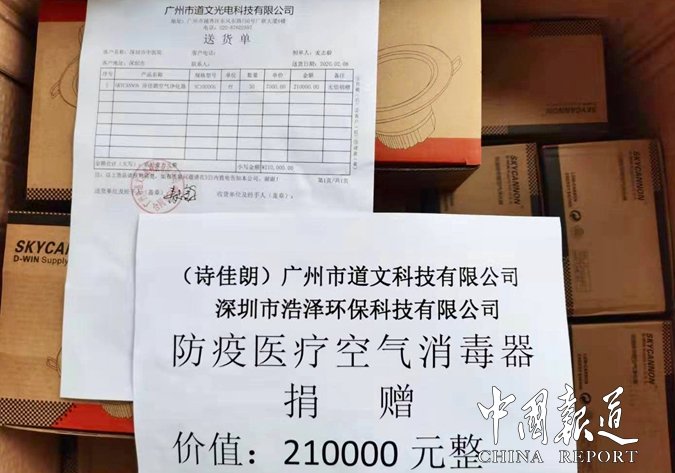 中国报道(吴蜀丰报道)同舟共济,众志成城!新型冠状病毒肺炎疫情正牵动着每一个中国人的心,在此次疫情防疫工作中,无数企业与公民都积极献出了自己的一份力量,广州市道文光电科技有限公司积极迅速反应,联合广州钰诚环保节能科技有限公司,深圳市浩泽环保科技有限公司,共同捐赠了价值60万元的首批90台诗佳朗杀毒空气净化设备,已进驻广州和深圳的抗疫前线,为正在一线奋战的白衣天使们提供健康呼吸保障!