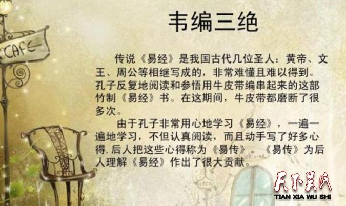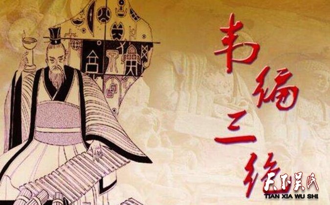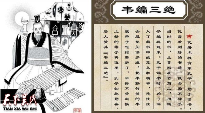 那时还没有纸张,制作书籍的材料主要是竹子。一般是把竹子削成一片一片的竹签,刮去上面的青皮,用火烘干后在上面刻字。称为“竹简”。竹简有一定的长度和宽度,一根竹简只能写一行字,多则几十个,少则八九个。写成一部书要许多竹简,书的内容全部写上去以后,要用牢固的牛皮绳子把这些竹片按顺序编联起来,这样才便于阅读。这样做的过程就叫做“韦编”。由于一片竹简只能写很少的字,所以如果一部书的字数很多的话,那就需要几十斤甚至上百斤的竹片。像《易经》这样的书,当然是由许许多多竹简编联起来的,因此相当沉重。孔子到了晚年才开始学习周文王所演的《周易》,即《易经》。《易经》是很难读懂的一部古书,孔子下了很大的功夫,才把它全部读了一遍,还只是基本上了解了它的内容。接着,他又读了第二遍,掌握了它的基本要点。然后,他又读第三遍,对其精神实质有了比较透彻的理解。此后,为了深入研究这部书,同时也为了给弟子们讲解,他不知翻阅了多少遍《易经》,这样读来读去,把串联竹简的牛皮带子也给磨断了好几次,不得不换上新的再读。即使读到了这样的地步,孔子还谦虚地说:“假如我能多活几年,我就可以更深刻地理解《易经》的文字与内容了。”孔子不仅读懂了《易经》,还在伏羲、文王和周公编著的基础上,增补了自己研习《易经》的好多精辟见解。所谓《易经》(周易)历经四圣而成,臻于完善,就是这个意思。