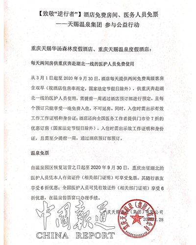 重庆天赐温泉集团也积极行动起来,旗下的重庆天赐华汤森林度假酒店、重庆天赐温泉度假酒店每天两间房供重庆奔赴湖北一线的医护人员免费使用,从3月1日起至2020年9月30日,酒店每天提供两间免费高级客房含双早(视酒店住房率而定,国家法定节假日除外),供重庆奔赴湖北一线的医护人员使用,需提前一周通过漕店预订部进行预定,且每个预订只能享受一晚免费入住,不可延房。同时,入住时需出示有效工作工作证明和身份证:酒店还向全国医务工作者提供门市价7折的优惠订房《国家法定节假日除外),入住时需出示效工作证明和身份证、且需至少提前一周,通过酒店预订部顶订。