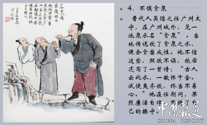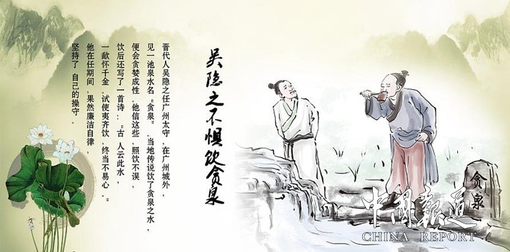 吴隐之不信这个邪,到广州后,他对亲人说:“不见可欲,使心不乱。越岭丧清,吾知之矣。”为了表明立志清廉,他特意来到贪泉,掬水而饮,并赋诗为志:“古人云此水,一歃怀千金。试使夷齐饮,终当不易心”。意思是:人们都说喝了这泉水,就会贪财爱宝,假若让伯夷叔齐那样品行高洁的人喝了,我想终究不会改变那颗廉洁的本心。
