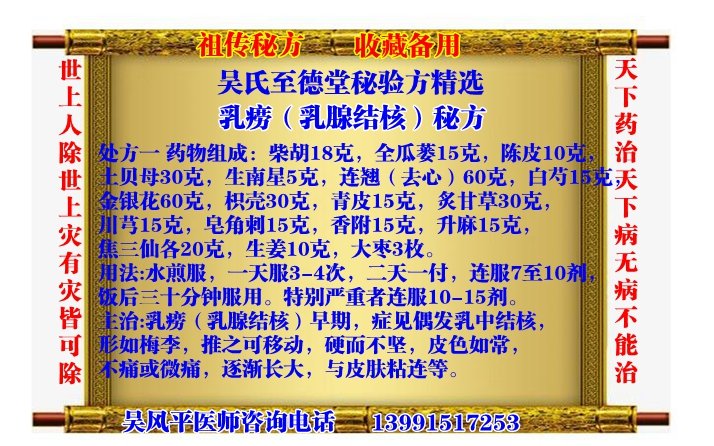 主治:乳痨(乳腺结核)早期,症见偶发乳中结核,形如梅李,推之可移动,硬而不坚,皮色如常,不痛或微痛,逐渐长大,与皮肤粘连等。