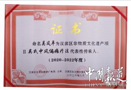 “吴氏中风偏瘫疗法“在吴氏九代传人吴风平教授的不懈努力下,现获得国家非物资文化遗产,吴风平教授是“吴氏中风偏瘫疗法”唯一继承人和持有者,他全面掌握了“吴氏中风偏瘫疗法”的全部诊疗技法,并在“吴氏中风偏瘫疗法完整的理论体系基础上,经过大量临床应用验证,进行了创新发明,治愈国内外中风偏瘫患者数以万计。