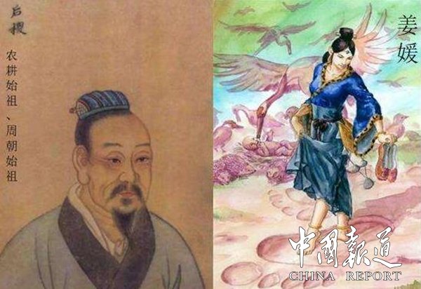 后稷的出生就极富传奇,《史记》载:“姜嫄出野,见巨人迹,心忻然说,践之而身动如孕者。居期而生子,以为不祥,弃之隘巷,马牛过者皆辟不践;徒置林中,适会山林多人,迁之;而弃渠中冰上,飞鸟以其翼覆荐之。姜嫄以为神,遂收养长子,初欲弃之,因名曰弃”。就是说,一次,姜嫄在出游途中,发现地上有一行非常大的巨人脚印,出于好奇,她用自己的脚在这个脚印上踩了一下,身体突然有一种感觉,姜嫄就怀孕了。十月怀胎生下一子,姜嫄认为是不祥之兆,就决定将这个孩子扔掉。把他扔到狭隘的小巷上,想让过道的牛羊踩死他,牛羊却绕道而行,保护养育;她又想把儿子放在树林中,正巧碰上那里伐木人太多,又给予照料,就抱着儿子走开;再想把他扔到河里的冰上冻死,却见天上的鸟雀飞下来用翅膀覆盖住他,给他送温暖,鸟一飞去,他就呱呱啼哭,哭声长而洪亮,一直传播到大路上。姜嫄心想,这个孩子是不是有神灵在暗中保护,于是就把这个孩子抱了回来抚养。由于起初把他抛弃过几次,所以给他起名叫弃。