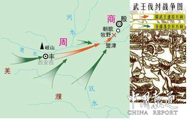 据史书记载,武王伐纣的这场战争,是一场力量悬殊的较量,武王继位第九年的帝辛31年(公元前1048)在孟津(今河南孟县南)大会诸侯,检阅军队,进行伐商演习,史称“孟津观兵”,阅兵部队分为三军,中军、左军和右军,由太师姜子牙统一指挥,从毕邑出发,到盟津结束,为起兵伐纣做准备,季历征服殷商三分之二国土的西周和剩余三分之一的商朝国内多个诸侯国沒有经过预期都自动来与武王的军队会盟,提出“纣可伐矣”。两年后,纣王昏乱暴虐无以附加,杀死了比干,囚禁了箕子,连太师疵、少师疆都抱着他们的礼器、乐器逃到了周地。人们不约而同的诉说殷商的残暴,请求周推翻殷商。武王见商纣王的残暴无德已激起天下公愤,认为替天行道、讨伐纣王、救百姓出水火的时机到了。于是在武王十一年十二月,武王联合庸、蜀、羌、髳、微、彭、濮等 8个部族“八伯诸侯”和800个部落,在周军的浑旗下,集结戎车300乘,,虎贲(近卫军)3000人,甲士45000人,渡孟津,誓师伐商,与商纣70万军队大战于牧野(今河南汲县北)。在姜太公率领下,东渡黄河之后,姜太公命令沉掉所有渡船,不留后路,次年二月和商军决一死战。伐纣开始后,战争发生了意想不到的变化,商兵倒戈,殷军土兵们让开道路,欢迎周军的到来。