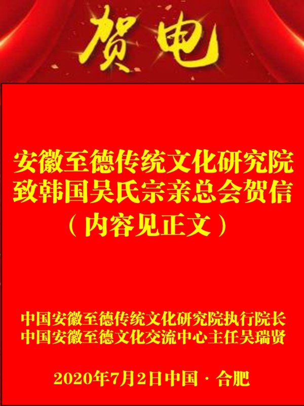 安徽至德文化研究院致韩国吴氏宗亲贺信