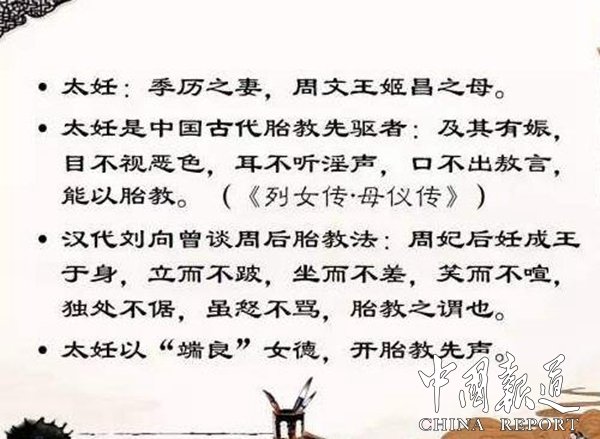 太妊在主持后宫期间,立身端庄,因为她的率先垂范,宫庭上下肃穆祥和。太妊有了身孕,怀上姬昌(即周文王)后,她眼睛不看邪事物和景象,耳不听淫逸无礼的声音,口不讲傲慢自大的言语,不歪着身子睡觉,闲时就正心静座,让乐师朗诵诗歌来陶冶情操。《烈女传·母仪传·周室三母》中记载:“大妊(太妊)者,文王之母,挚任氏中女也。王季娶为妃。大妊之性,端以成庄,惟德之行。及其有娠,目不视恶色,耳不听淫声,口不出敖言,能以胎教。溲于豕牢,而生文王。文王生而明圣,太妊教之,以一而识百,卒为周宗。君子谓大妊为能胎教。古者妇人妊子,寝不侧,坐不边,立不跸,不食邪味,割不正之食,席不正不坐,目不视于邪色,耳不听于淫声。夜则令瞽诵诗,道正事。如此,则生子形容端庄,才德必过人矣。故妊子之时,必慎所感。感于善则善,感于恶则恶。人生而肖万物者,皆其母感于物,故形音肖子。文王母可谓知肖化矣。”这就是说,太妊在怀孕之时,以保持仁爱祥和的心态,让胎儿受到良好的教育。