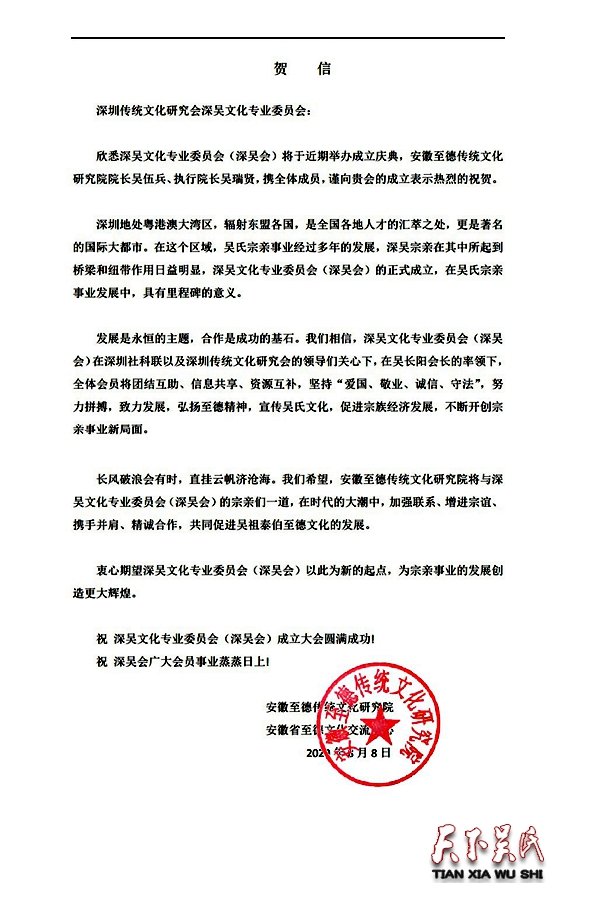 欣悉深吴文化专业委员会(深吴会)将于近期举办成立庆典,安徽至德传统文化研究院院长吴伍兵、执行院长吴瑞贤,携全体成员,谨向贵会的成立表示热烈的祝贺。