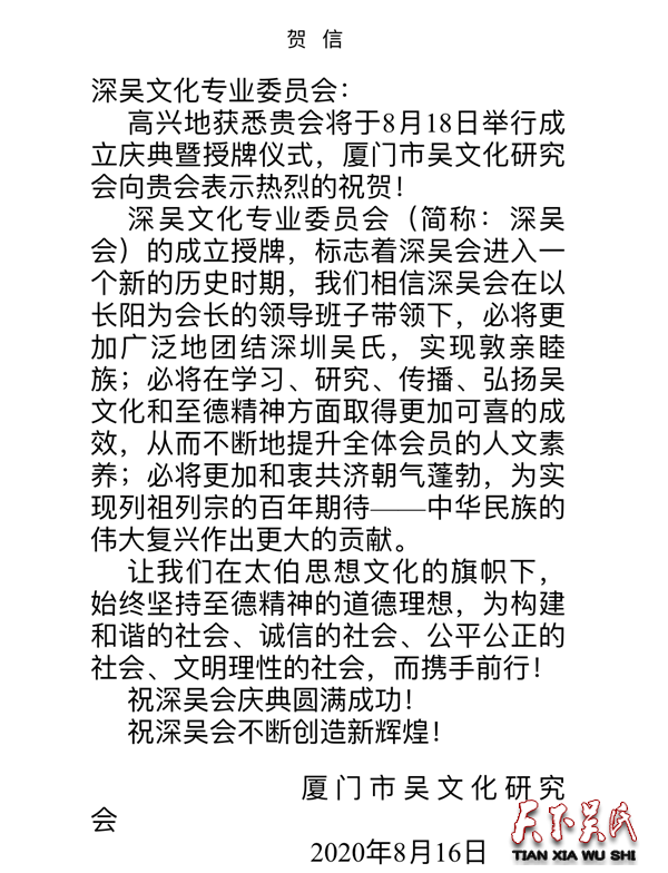 高兴地获悉贵会将于8月18日举行成立庆典暨授牌仪式,厦门市吴文化研究会向贵会表示热烈的祝贺!