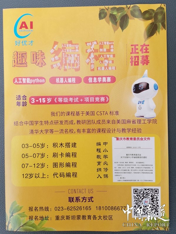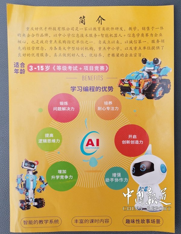 中国报道讯(吴蜀丰 报道)【编者按】未来是属于孩子的,未来是属于科学的,学校教育要重视培养学生创新思维和探索能力。机器人将与30年前的个人电脑一样迈入家家户户,彻底改变人类的生活方式。重庆市政府有关政策解读要求:明确指出小学3-6年级课时数;以及初中阶段课时数;各中小学至少配备1名编程教育专职教师。重庆好优才科技是一家以教育培训类软件研发、生产、教学、考级、参展、比赛和市场拓展于一体的央企合作品牌,以中小学信息技术+智能机器人+信息学奥赛为企业核心,政府重点采购指定单位之一。公司自成立以来,以诚信第一、服务领先的经营理念,为诸多幼儿园,大中型培训机构,中小学以及重点单位提供了良好的优质服务,真正做到好人生,优培养,才栋梁的企业宗旨;