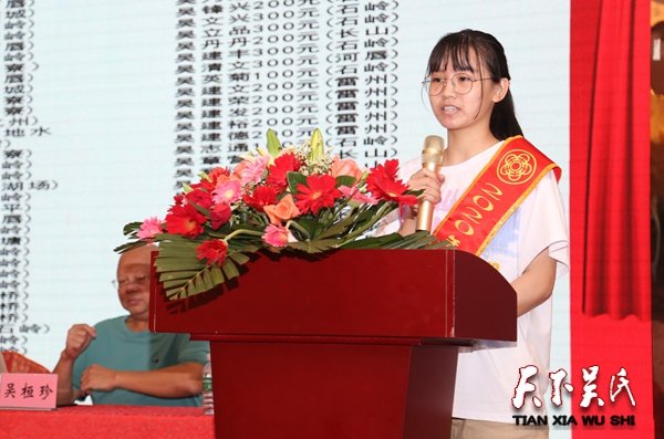 此次活动捐资12000元助学的吴华豪表示,捐资不论多少,能够奖励优秀学子,将活动举办成功就是最好的心愿。“我们宗族的学子通过努力学习,考取了理想大学,这是大家最开心的事情,奖学金是对他们努力的最大肯定,也是对他们学业最大的鼓励,希望他们能够发扬泰伯精神,努力奋斗,早日回报家乡。”考上暨南大学的吴美玲代表学子们作了发言。她表示,一定好好学习,不忘父母养育之恩,不忘师长的培养之情,不忘自己的家乡,不忘宗亲们的爱心!宗亲们对我们的祝愿,是爱,是鼓励,更是对我们的期望。会时刻告诫自己,一定要加倍努力学习,对祖国负责,对自己和家乡负责,决不辜负社会和宗族的期望,努力学成归来,回报党和国家,回报社会,回报家乡父老。
