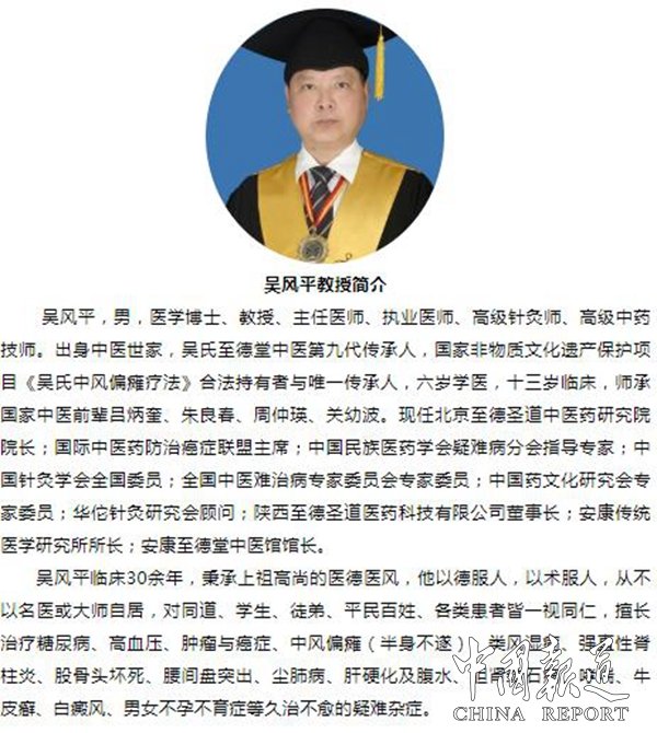 吴风平,男,医学博士、教授、主任医师、执业医师、高级针灸师、高级中药技师。出身中医世家,吴氏至德堂中医第九代传承人,国家非物质文化遗产保护项目《吴氏中风偏瘫疗法》合法持有者与唯一传承人,六岁学医,十三岁临床,师承国家中医前辈吕炳奎、朱良春、周仲瑛、关幼波。现任北京至德圣道中医药研究院院长;国际中医药防治癌症联盟主席;中国民族医药学会疑难病分会指导专家;中国针灸学会全国委员;全国中医难治病专家委员会专家委员;中国药文化研究会专家委员;华佗针灸研究会顾问;陕西至德圣道医药科技有限公司董事长;安康传统医学研究所所长;安康至德堂中医馆馆长。