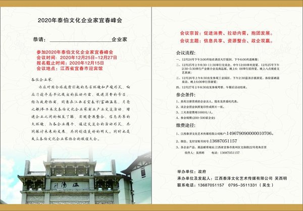 中国报道讯(吴蜀丰报道)为应对因全球疫情引起的恶劣环境和严峻形式而拉动内需、促进消费、抱团发展。经与政府协商,同意在江西省宜春市(富硒温泉、月亮之都)举办本次吴氏企业家商业产业交流活动,增进企业之间的相互了解,实现资源整合、信息共享的大环境,与各企业携手,通过交流会的活动形式,共同探讨未来的发展,共同创造美好的明天。同时也是成立吴氏企业家协会的联谊大会,不分区域,没有派系,只要你姓吴,你就能参加。