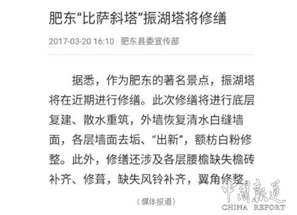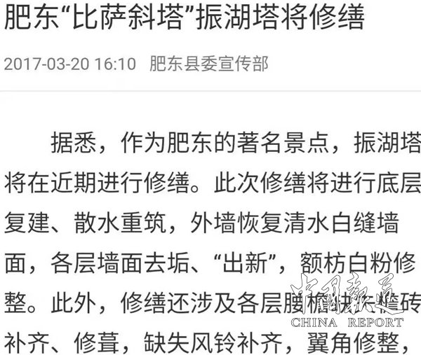 塔有点斜。肥东县有关方面在2017年3月20日发表文章《肥东“比萨斜塔”振湖塔将修建》,文中,“工作人员表示,振湖塔发生倾斜是上世纪六七十年代因村民在塔边挖深坑所造成的”。上世纪七十年代初至1982年春节,我在老家生活。老家对此有不一样的解释,说抗日战争期间,日本鬼子飞机准备轰炸不远处巢湖姥山岛上的文峰塔,飞到这里,误将此塔当作文峰塔,投下炸弹,将塔炸斜了。故事不知真假,塔身斜是真的,好在经过政府修缮,看不出斜的样子。镇湖塔也在1998年5月4日,被公布为安徽省文物保护单位。