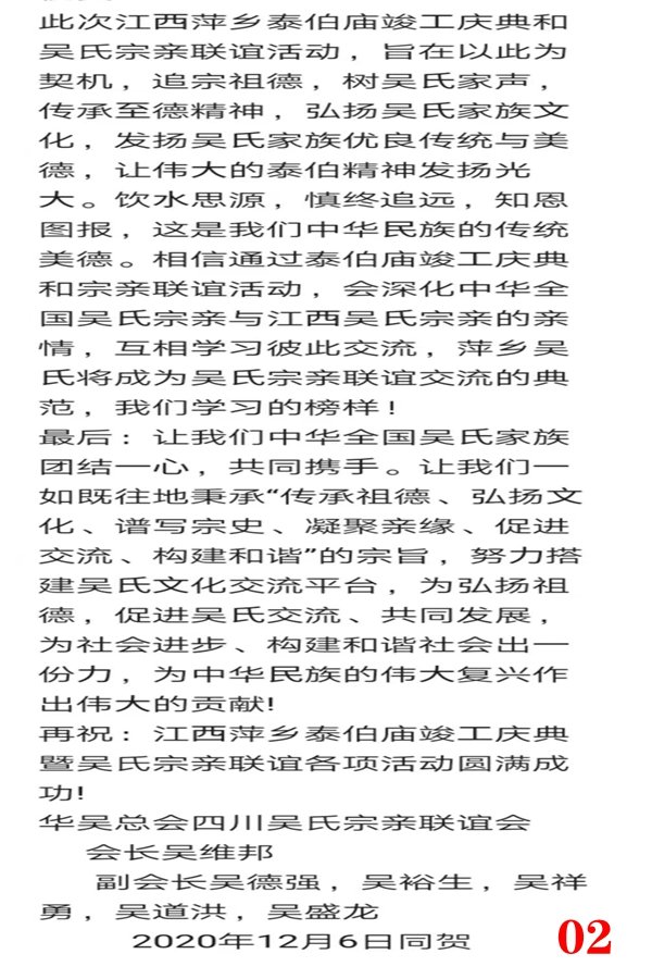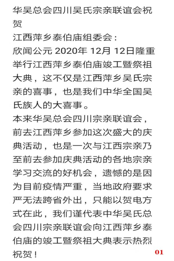 欣闻江西萍乡泰伯文化宫《泰伯庙》竣工暨祭祖大典时间定于2020公历12月12日农历(十月二十八日)星期六在江西萍乡湘东区泰伯文化宫举行,这是江西萍乡吴氏宗亲的喜事,也是我们吴氏家族的好事,我代表无锡市吴文化研究会特对此表示热烈的祝贺!