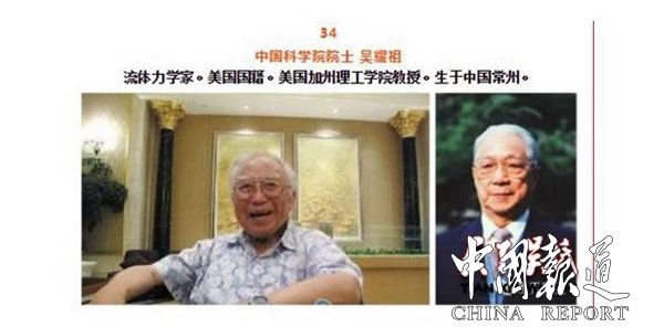 34吴耀祖,1924年出生于江苏常州,流体力学家,美国国家工程院院士、台湾“中研院”院士、中国科学院外籍院士,美国加州理工学院教授。