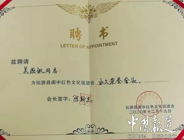 吴燕秋最后表示,仙游闽中红色文化促进会将通过开展红色文化宣传,教育推广交流活动,深入开展革命传统教育和爱国主义教育,开展不忘初心、牢记使命革命传统和优良作风宣传教育,弘扬党和军队的优良传统,用革命先辈的民族精神、无私情怀、不怕牺牲的崇高风范,启迪和凝聚更多的双拥力量,发挥公益力量,为革命老区和红色遗址建设,为美丽莆田做出更大的贡献。