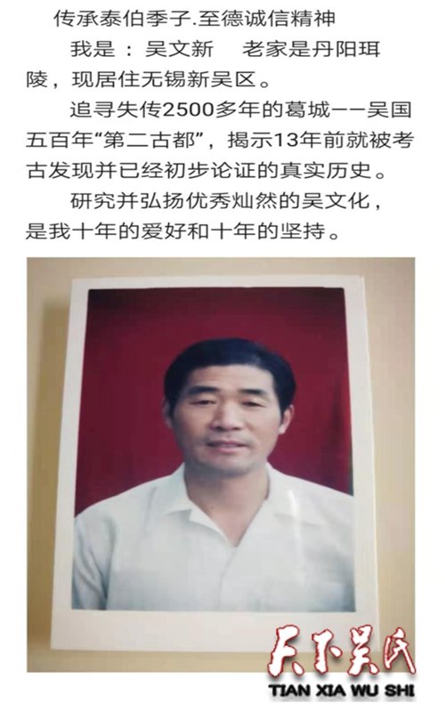基于2007年在我老家丹阳考古发现了葛城古都,我一直非常感兴趣。但如今,已经上升到了一种责任感,我要把考古发现葛城古都的历史成果之信息,传递到无锡,让泰伯祖地吴氏宗亲联谊会,及广大吴氏宗亲都知道此历史信息,既要让大家分享成果,又要努力促使,让第四代吴王周章——寿梦,其400多年间失落的古都,能够从历史中找回来,填补此重大的历史空白,更要感动历史文物专家,参与进行广泛深入的调查研究。