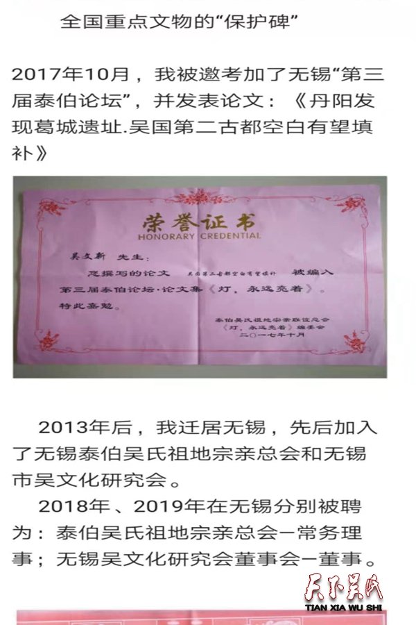 由于生活的改变。我2013年退休后,因儿子在无锡,我也随儿子将户籍迁到了无锡,现也居住在无锡新区。我是无锡人,也是丹阳人。2016年上半年起,我就积极热情的,参加无锡吴文化节和吴氏宗亲联谊活动,去年十月,被正式聘任为泰伯租地吴氏宗亲联谊会理事,我感到非常荣幸。既加深了与吴氏宗亲的感情,又增进了对吴文化研究的热情。