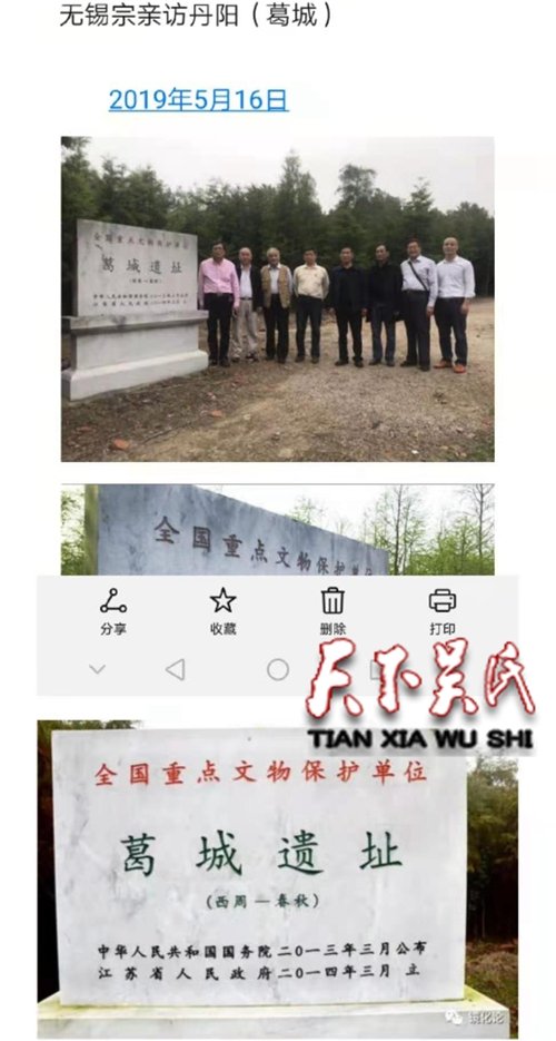 丹阳考古发现“葛城遗址”,已过去整整十年。真因为,咱们无锡吴氏宗亲会,是世界吴氏、天下吴氏之泰伯祖地啊!一万年太久,只争朝夕。我热情期待,首先,要引起泰伯祖地吴氏宗亲联谊总会领导的重视,让祖地吴氏宗亲们充分了解,更有历史文化研究人员积极参与。现如今,我将同大家一起积极努力,能够使得,该历史失忆四百多年的吴国都城(葛城)将会苏醒,“吴国第二古都”得以确认。这一历史文化遗产,会尽早写进历史,并奉献给所有天下吴氏。其次,江阴与丹阳季子文化的两地交流及旅游开发,将进入良性循环。