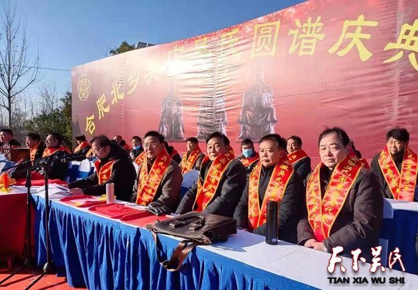 天下吴氏讯(吴瑞贤)山寒水瘦助力昨日银蛇飞舞,祥云送瑞迎来畅月红梅飘香。2021年1月8日的合肥北乡,寒风凛冽暖阳高照。零下9度的气温,寒气沁身使人瑟瑟发抖。可是,在安徽省长丰县吴店社区,原吴氏祠堂旧址旁的社区委文化广场却热闹非凡。分别来自合肥市、池州市、淮南市、滁州市及肥东、肥西和长丰县吴山镇、下塘镇、水湖镇、双墩镇下辖8个行政村、社居委的数百名族人聚集在这里。他们个个笑逐颜开,喜悦上了眉梢欢乐堆积脸庞。热烈祝贺合肥北乡吴店吴氏祭祖圆谱庆典圆满成功的数只彩球当空飘舞,一面面彩旗迎风招展,挂有不同地区牌照的近百辆小车在道路一侧有序停放。