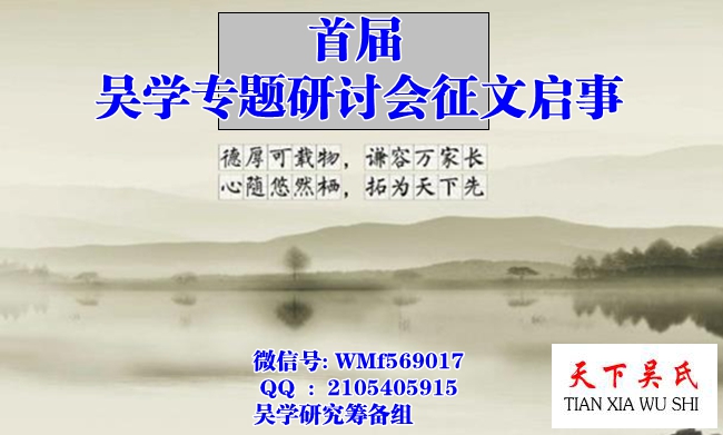 天下吴氏讯(吴美福报道)为弘扬吴学,传承吴文化。拟定于今年10月中旬召开首届“吴学” 专题研讨会,决定凝炼各家的论说,集成一本专著,作为“吴学” 的创刋号,达到抛砖引玉的作用,以期引起更多的专家学者进行更广泛的研究,期盼大家踊跃撰稿。