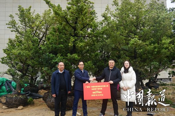 中国报道讯(吴蜀丰 通讯员覃源 韦利娜)2月1日,香港进源集团广西第一湾国际旅游股份有限公司在东兰县向拔群干部学院捐赠36棵名贵古树,拔群干部学院常务副院长覃英学,副院长兰英参现场接受捐赠。